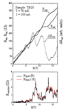 Fig.1 shows Rxx, Rxy and non-local data for the case of a high bulk doping level. In addition, Rxx is also shown after subtracting the linear back ground (labelled deltaRxx). Bulk-Shubnikov de Haas (SdH) oscillations can be observed up to B=15 T. There can be found a striking similarity with the quantum Hall effect (QHE): (i) There are onsets of plateaux in Rxy which corresponds to minima in Rxx (deltaRxx). (ii) The maxima in Rxx (deltaRxx) appear in the regime of maximal slope in Rxy. However, the "plateaux" correspond to bulk-SdH oscillations and therefore cannot be attributed to 2D- fillingfactors. As explained below, this is not in contradiction with the model ! The key- point of the model is that one has to consider the native potential fluctuations in the electron channel as a substantial part of the electron system. They are equal or even larger than the typical subband splitting. This causes intersections of the Fermi level (EF) with the Landau-subband levels and consequently magnetic bound states ("EC- loops") in the bulk region can be created. These provide the possibility for EC-backscattering via tunnelling across these loops. A small subband splitting at EF leads to a high "loop density" and thus to strong back scattering. This happens if EF crosses a bulk Landau level (LL). In this way we get a remarkable correspondence between a standard quantum Hall (QH) system and our WPQW-system: (i) In QH-systems EC-back scattering occurs if a LL crosses EF while in the WPQW EC-back scattering is maximal if EF crosses a bulk-LL. (ii) The energy range between bulk- LL’s in the WPQW corresponds to the energy range between 2D- LL’s in the QH-system. If EF is between LL’s in the 2D system, EC-backscattering is completely suppressed while it is just reduced if EF is between bulk LL’s in the WPQW-system . This is because the subband splitting is larger at energies well above the bulk LL’s [1] and consequently the loop density and thus back scattering is reduced in this regime. This is also evident from the non- local signal (Fig. 1): The minima of Rxx (deltaRxx) correspond to maxima of the non-local signal. (iii) The role of the localised states in the QH system is taken over by the 3D-like valley in the PbTe WPQW’s. However, the 3D- like system is not isolating and therefore the zeros in Rxx are missing and a linear slope is superimposed to Rxx instead [4]. Finally the non-local signal clearly satisfies the Onsager-Casimir relation for the complete pattern. This is another indication that the general non-local behaviour and the superimposed fluctuations have the same physical origin.