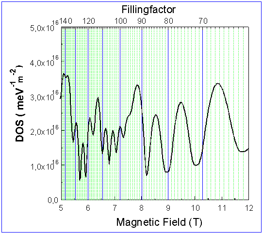 Fig.2: Density of states at the Fermi level versus magnetic field and filling factor according to Fig.1