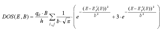 The subband energies are calculated selfconsistently by a numerical solution of the Schrödinger equation within the effective mass approximation. The energy level system consists of all Landau levels (LL's) sitting on each of the subband levels. Since in wide quantum wells the Landau level separation is much higher than the subband splitting, a picture which considers the Landau levels to be split by the subband quantization is more convenient. Therefore simply the Landau levels resulting from a 3D- calculation according to [7] are used (for more details on 3D-Landau levels of PbTe see also e.g. [8] or [9]). The modelling of the density of states (DOS) then is easily done by a superposition of individual Landau peaks with an appropriate broadening factor b. The broadening function in this approximation is assumed to be Gaussian. The total DOS as a function of energy E and magnetic field B then reads as follows: