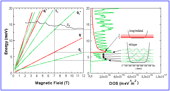 The reason can be seen from Fig.1b. In this figure the DOS is plotted for a constant magnetic field of B = 7 Tesla. An overall enhancement of the DOS near the position of the 3D-LL's levels can be understood from the overlap of the DOS- peaks of the lowest Landau-subband states. The LL's of the subband ground states at B = 7 Tesla are marked by the dotted lines guiding from Fig.1a to Fig.1b. Because of the small subband separation in the longitudinal valley their contribution to the DOS is more or less a uniform background which is indicated schematically by the solid red line in Fig.1b.