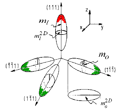 quantisation. The other 3 oblique valleys are equivalent and lead to an effective mass mo for quantisation, which is