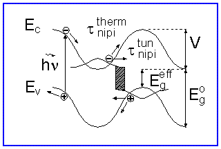 Scheme of the potential modulation V in a nipi structure: The lifetime of photogenerated carriers is limited due to tunnelling and thermally activated recombination
