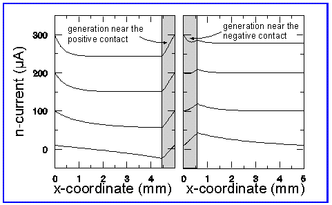 Current distribution in the n-layer for inhomogeneous generation. The shaded areas indicate the generation regions, which are choosen to be either near the positive contact (left side) or near the negative contact (right side).