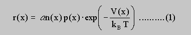 where x is the lateral coordinate of the linear shaped sample, n(x) and p(x) are the two dimensional carrier concentrations, V(x) is the potential modulation, T is the temperature and alpha is a constant prefactor. The generation-recombination kinetics is a dynamic process with a generation resulting in a current flowing from the n- to the p-layers (because of the internal electric fields) and a recombination resulting in a current from the p- to the n-layers. For the local treatment a leakage current density jB (x) is introduced with